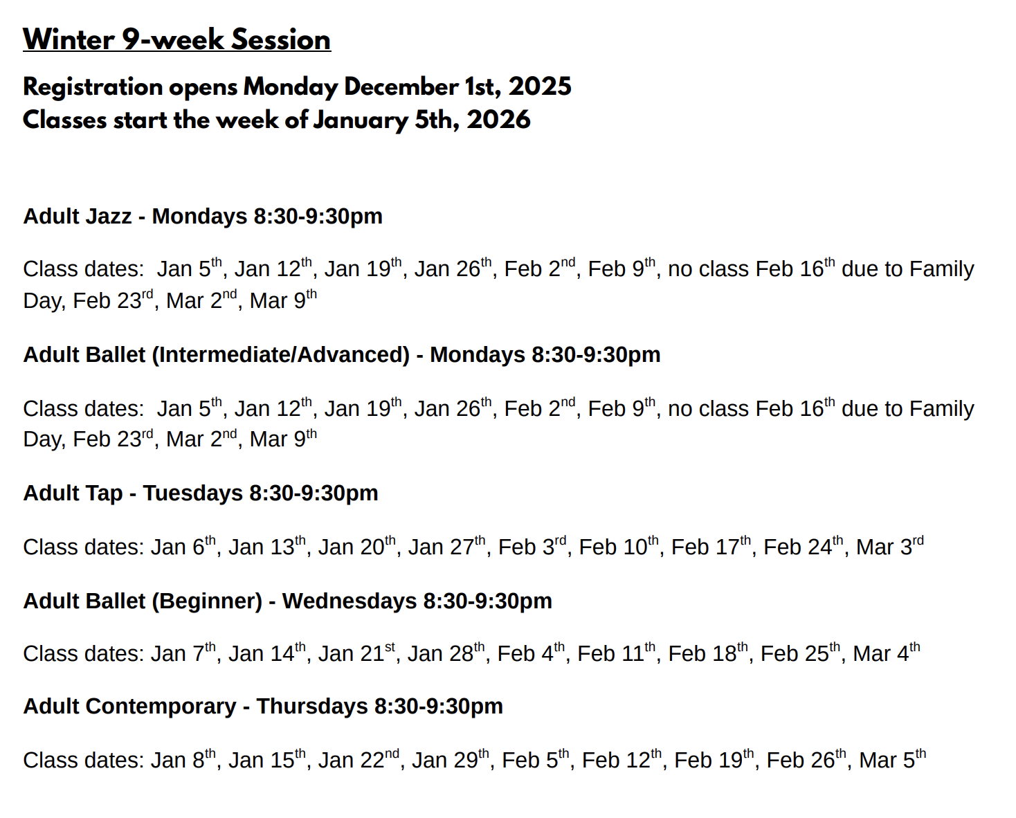 Winter Session begins the week of Jan 5th 2026
