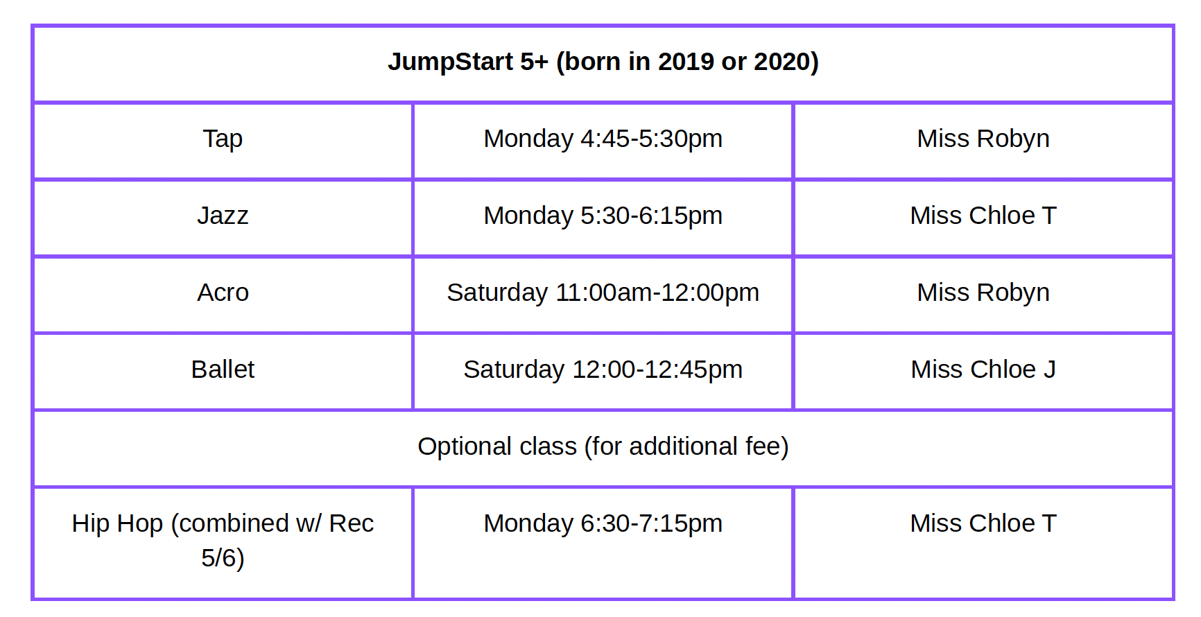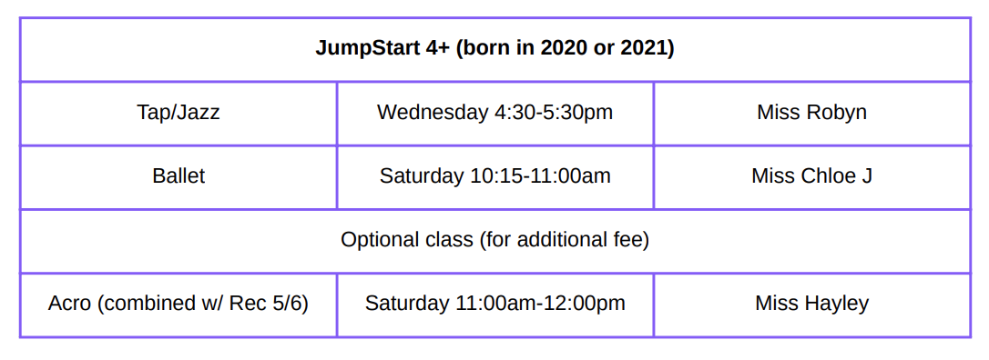 The jump-start program is offered for dancers ages 4+ (born in 2020-2021)  5+ (born in 2019-2020), 7+(born in 2017-2018), 9+ (born in 2015-2016 and earlier) and 11+ (born in 2014 and earlier)