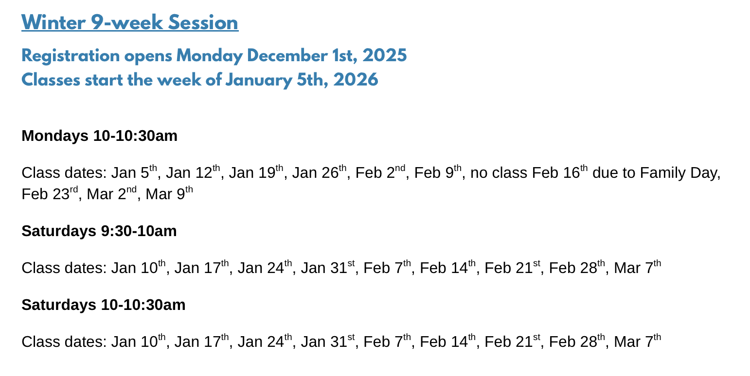 Suggested uniform: Activewear for both parents & children. Bare feet or ballet slippers (for dancers). No outdoor shoes, no socks for dancers.